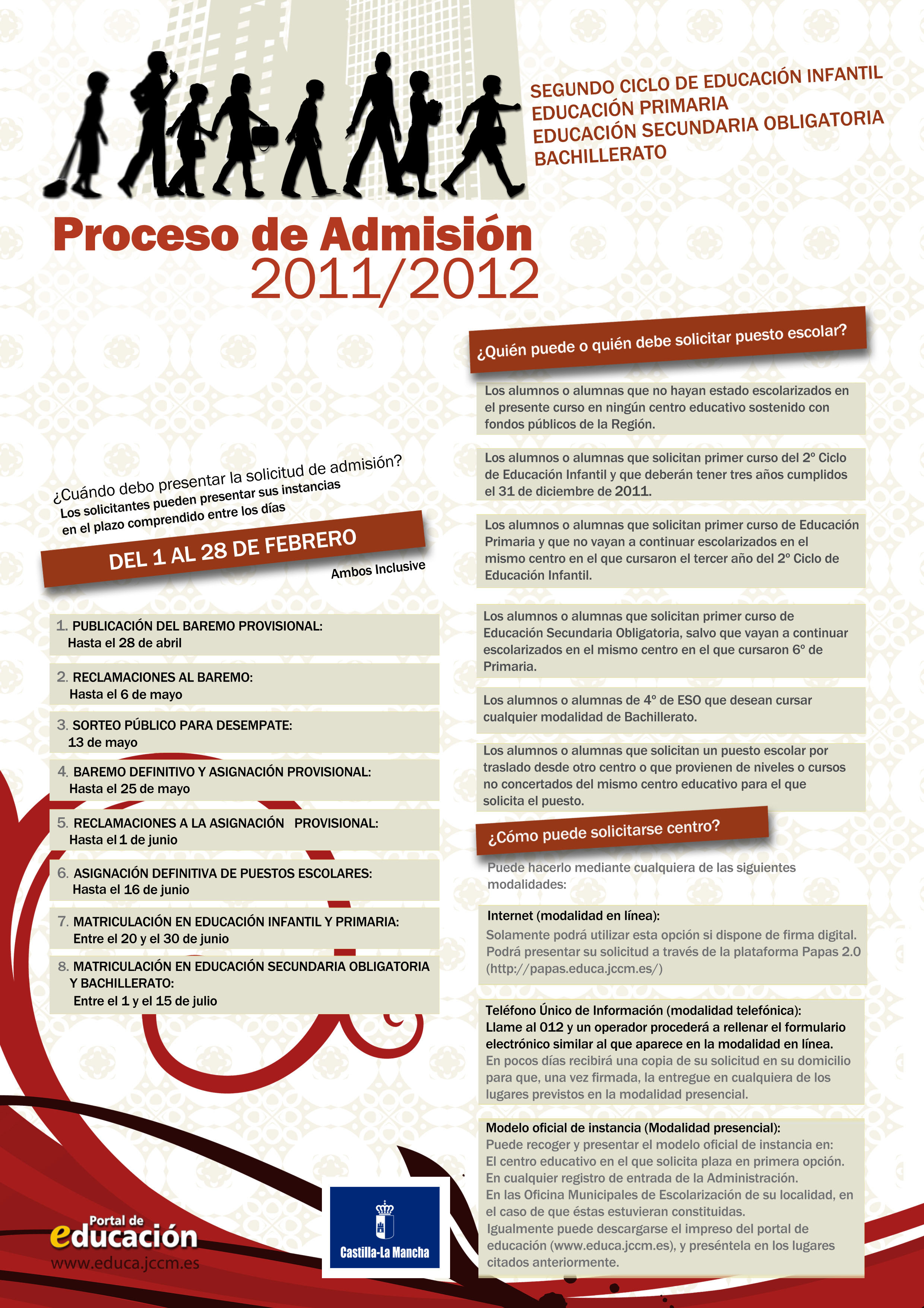 Las familias castellano-manchegas podrán solicitar, a partir del día 1 y hasta el 28 de febrero, centro educativo para el próximo curso 2011-2012 en el segundo ciclo de Educación Infantil, Educación Primaria, Educación Secundaria Obligatoria y Bachillerato, tanto en la enseñanza pública como concertada.